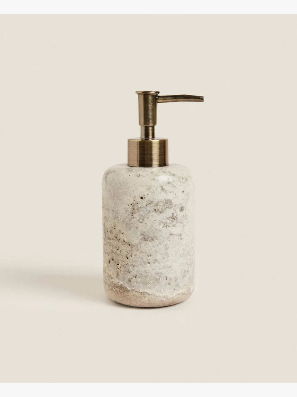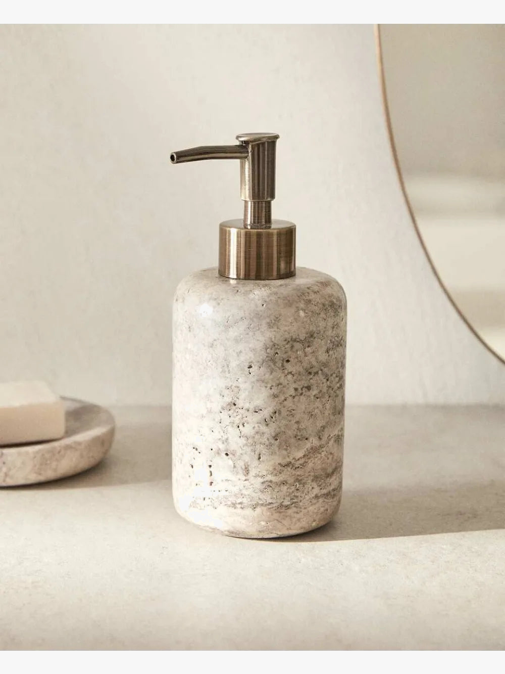 Un design intemporel pour le distributeur de liquide rechargeable en marbre travertin naturel