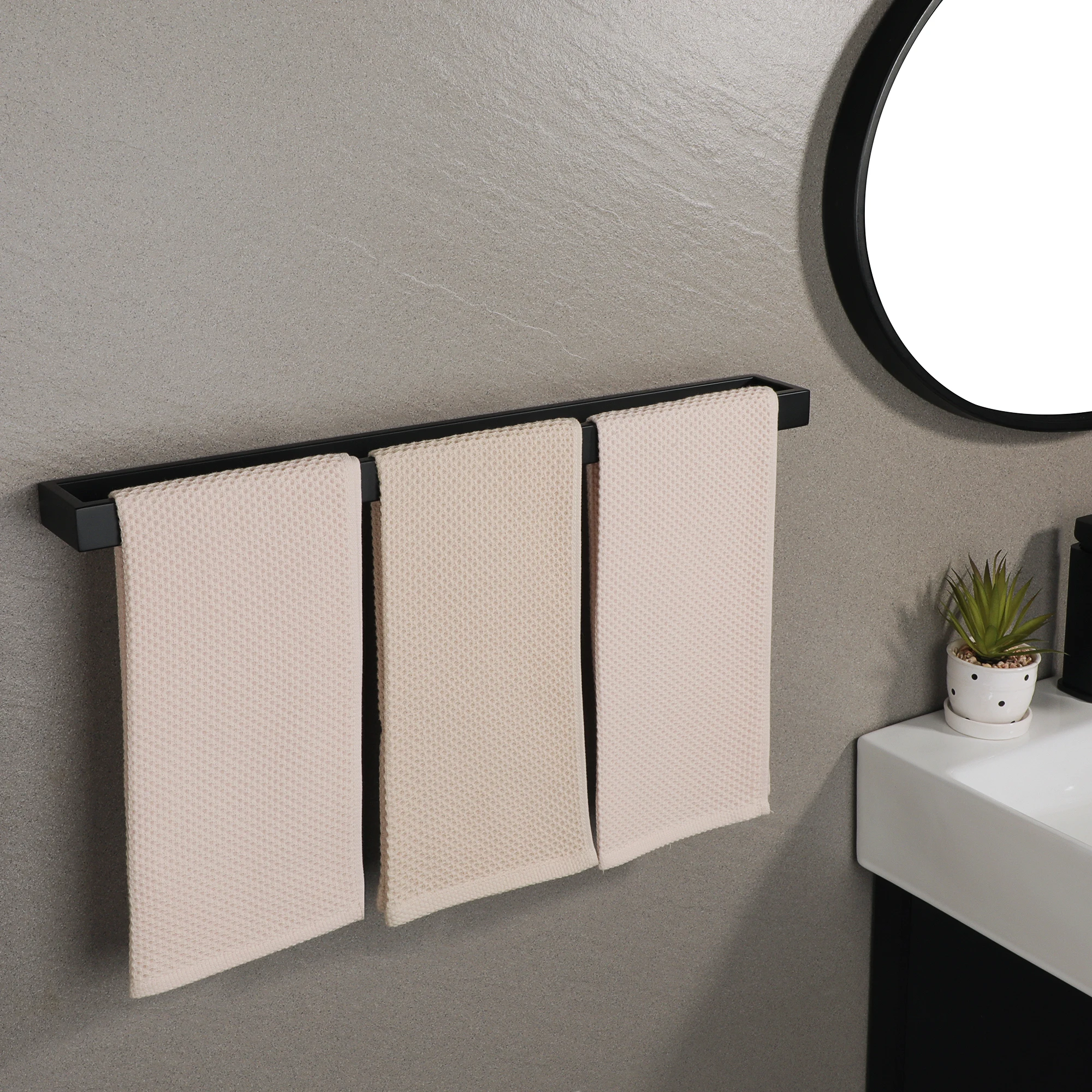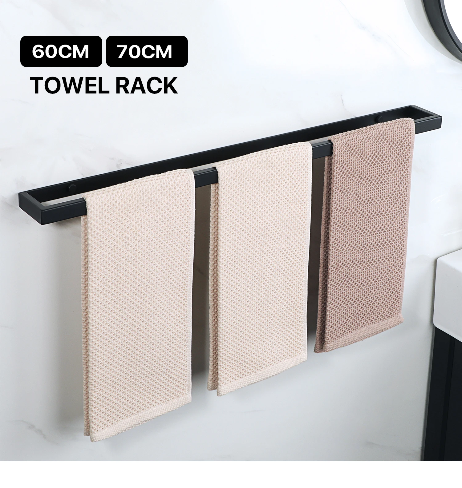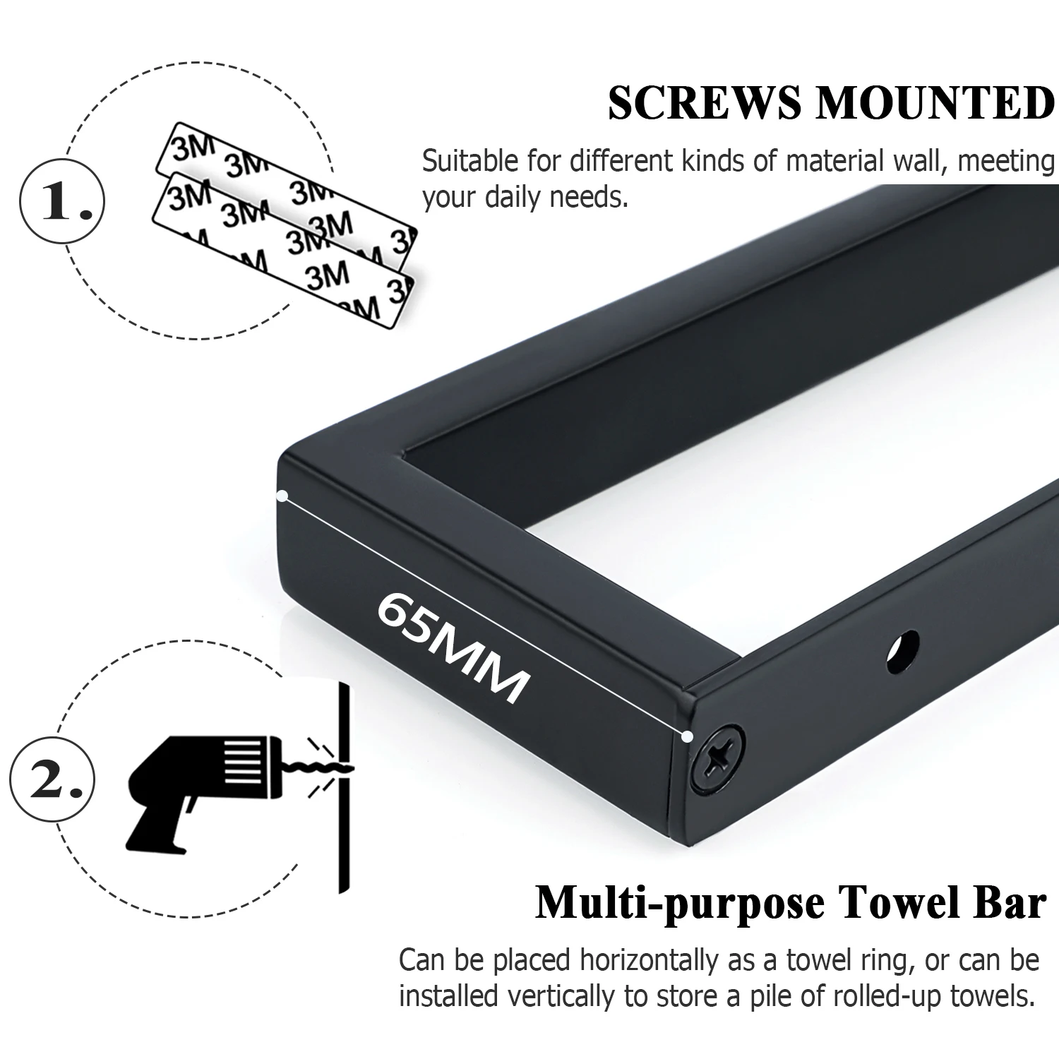 Le Porte Serviette 60cm est pensé pour une installation sans tracas. Que vous choisissiez la fixation murale vissée ou l’option adhésive, ce produit s’installe facilement, vous offrant ainsi une flexibilité maximale selon vos besoins et préférences en matière de design.