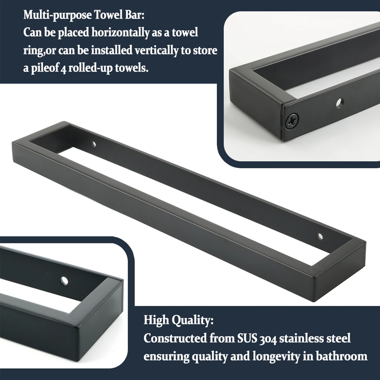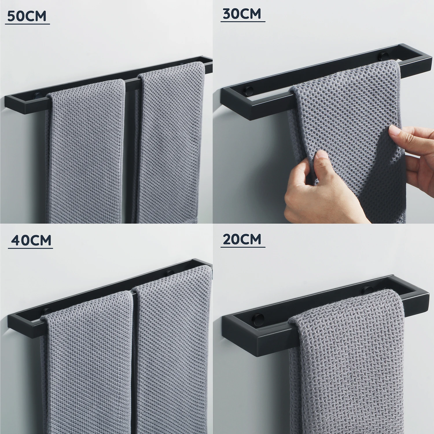 Le Porte Serviette Noir Mural s’adapte à tous vos besoins grâce à ses différentes longueurs disponibles. Que vous préfériez le disposer horizontalement pour des serviettes de bain ou verticalement pour les petites serviettes, sa flexibilité d’installation en fait un choix idéal pour tout espace, petit ou grand.